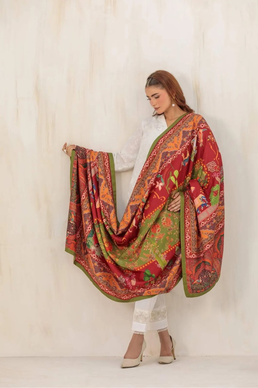 Afsana is a striking shawl that blends traditional artistry with contemporary elegance. Draped in a rich palette of crimson, orange, and green, it features intricate motifs inspired by Mughal miniature aesthetics, delicate florals, and ornate patterns. The vibrant colors and detailed designs evoke a story of heritage and grandeur, making it a timeless accessory for festive and winter wardrobes. Its bold yet graceful presence makes it perfect for both casual layering and statement styling.