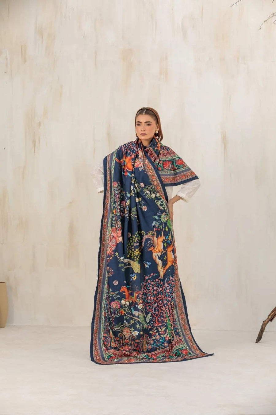 Amaya is a stunning shawl designed on a deep blue base, brought to life with intricate heritage-inspired artistry. The design features vibrant floral vines, traditional motifs, and miniature-style illustrations that weave together a tale of elegance and culture. Rich accents of red, green, and gold create a striking contrast against the blue, making Amaya both timeless and regal. A versatile piece, it adds a touch of sophistication to both festive gatherings and winter wear.