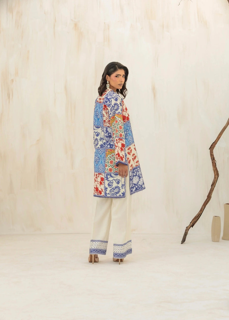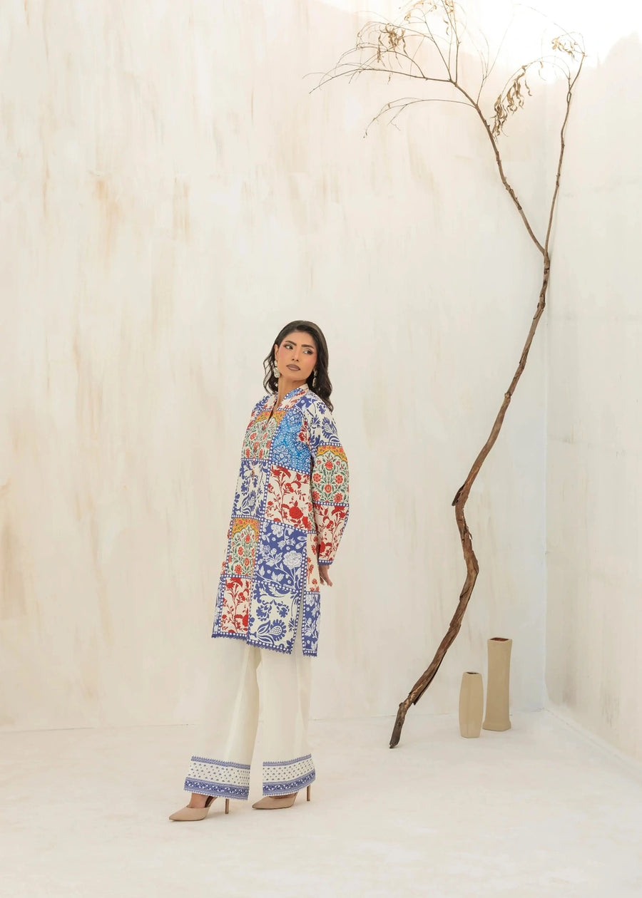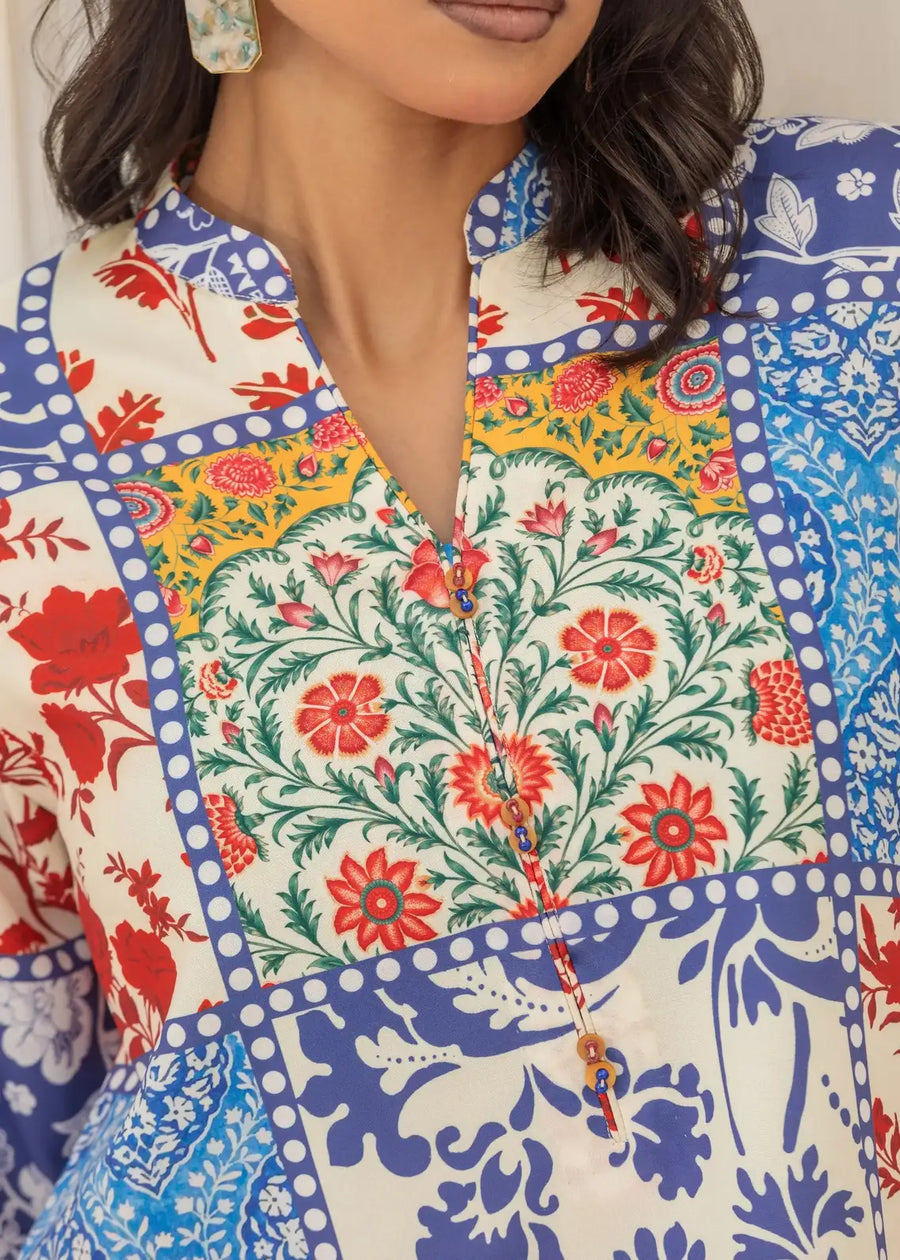 A charming block-printed, relaxed-fit kurta in a soft beige hue, featuring a round neckline for an effortlessly elegant look. The statement sleeves, adorned with intricate lace and delicate Suzani patterns, add a touch of femininity. Paired with a matching straight-fit trouser, boasting complementary Suzani motif borders, this ensemble exudes grace and sophistication perfect for daytime gatherings or festive occasions.