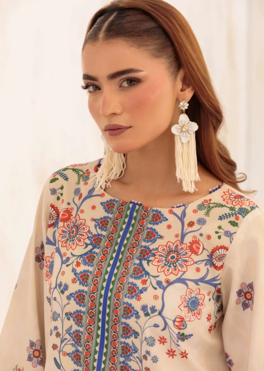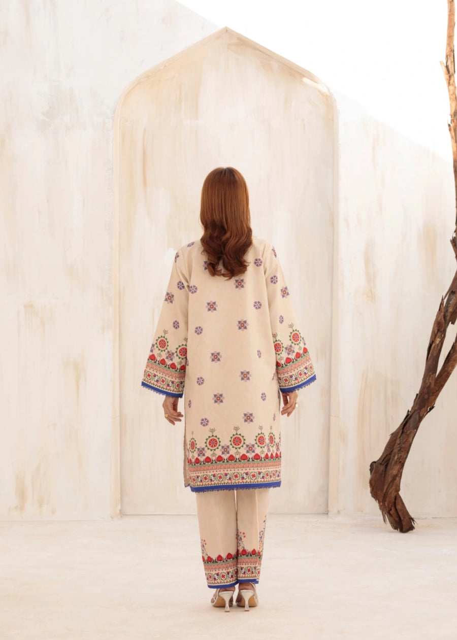 A charming floral-printed, relaxed-fit kurta in a soft beige hue, featuring a round neckline for an effortlessly elegant look. The statement sleeves, adorned with intricate lace and delicate Suzani patterns, add a touch of femininity. Paired with a matching straight-fit trouser, boasting complementary Suzani motif borders, this ensemble exudes grace and sophistication perfect for daytime gatherings or festive occasions.