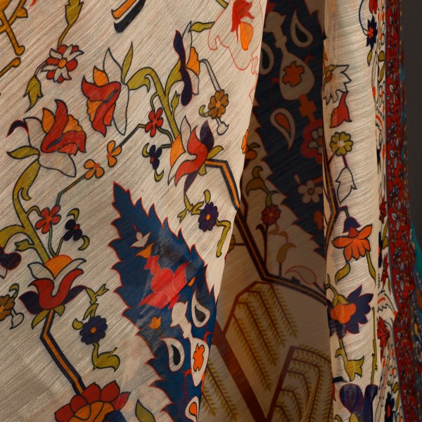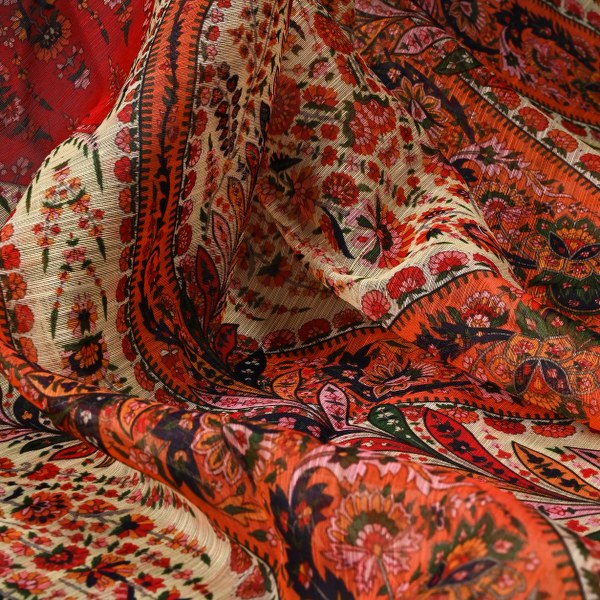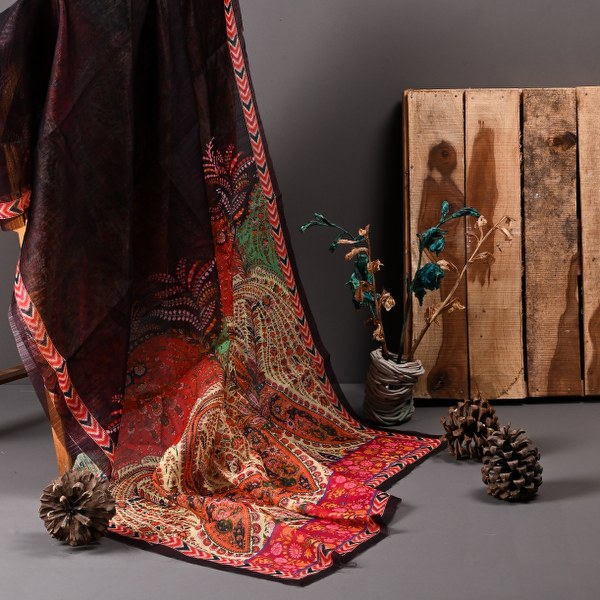 Your love of paisley and blacks comes together in Dalileh. While it features intricate design at the pallus, the center is kept light with just subtle printing in the background.