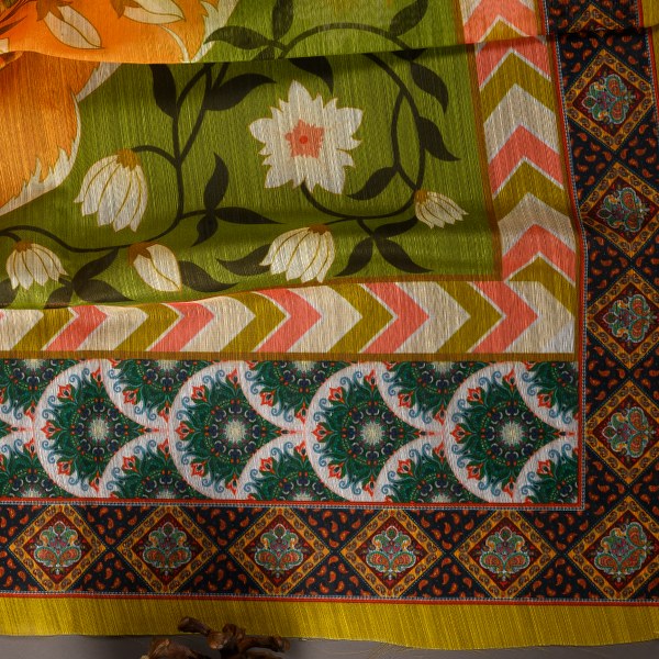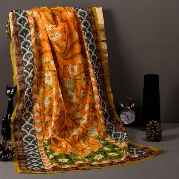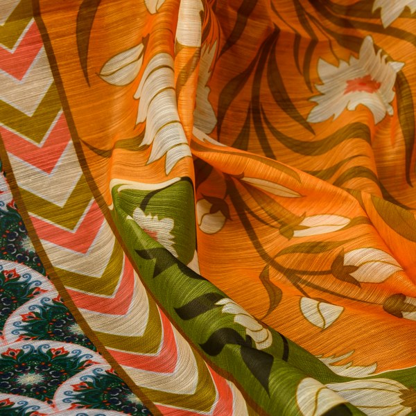 A demure piece, Amira features pristine white floral motif, juxtaposed against a shade between merigold and monarch orange. Hints of green give it a pop of color.