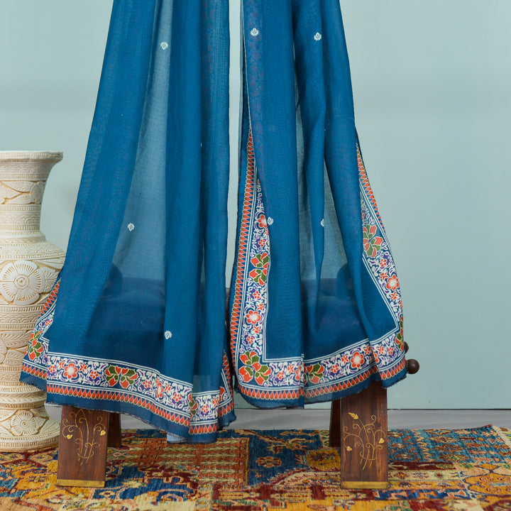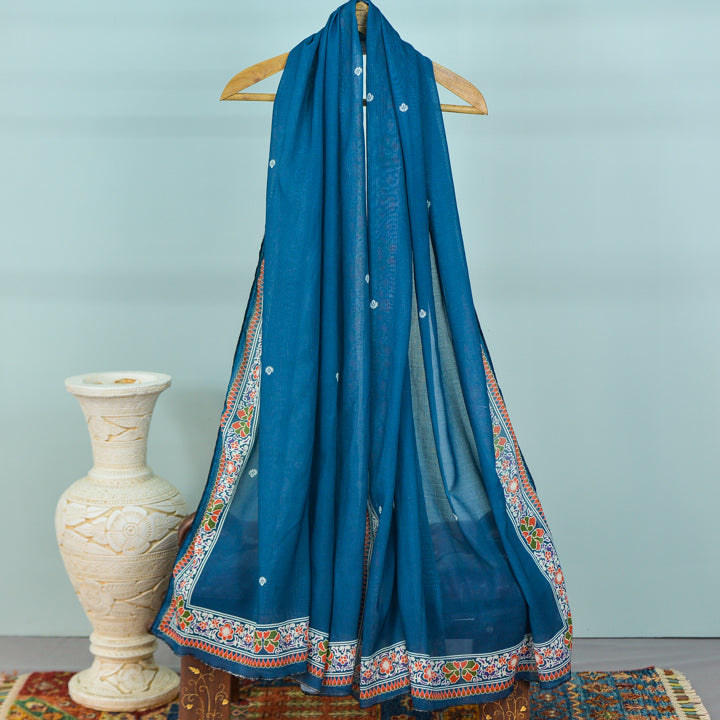 We use a lush Baltic blue shade for the canvas. The intricate border is a weaving of botanical elements, in different colors to lift the shawl. Strewn across the shawl/dupatta are dainty white motifs, that make the shawl sing. Pair with solid co-ords, take with your favorite peshwas, throw over your banarsi saari, make your own style statement with our mid-season shawls.