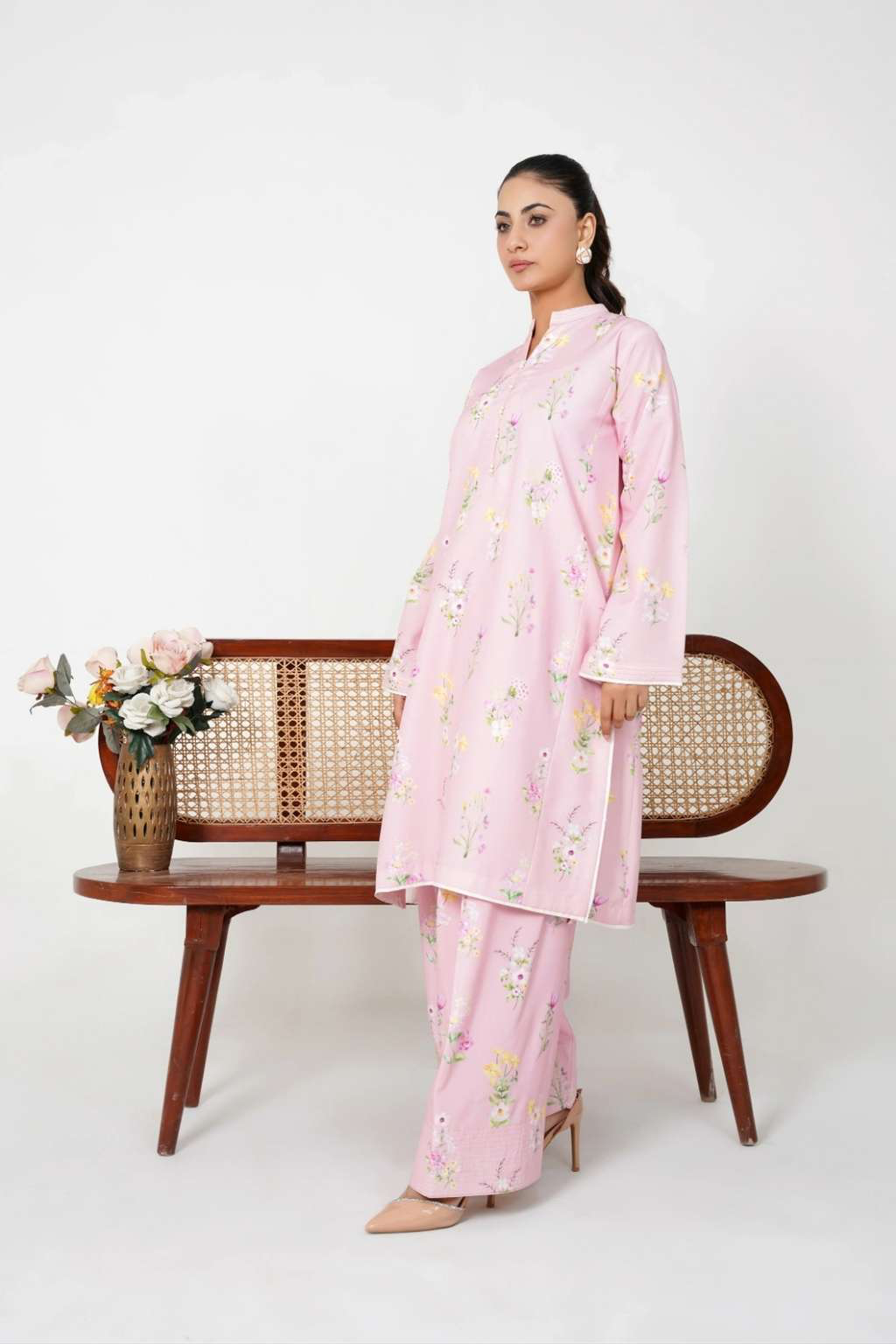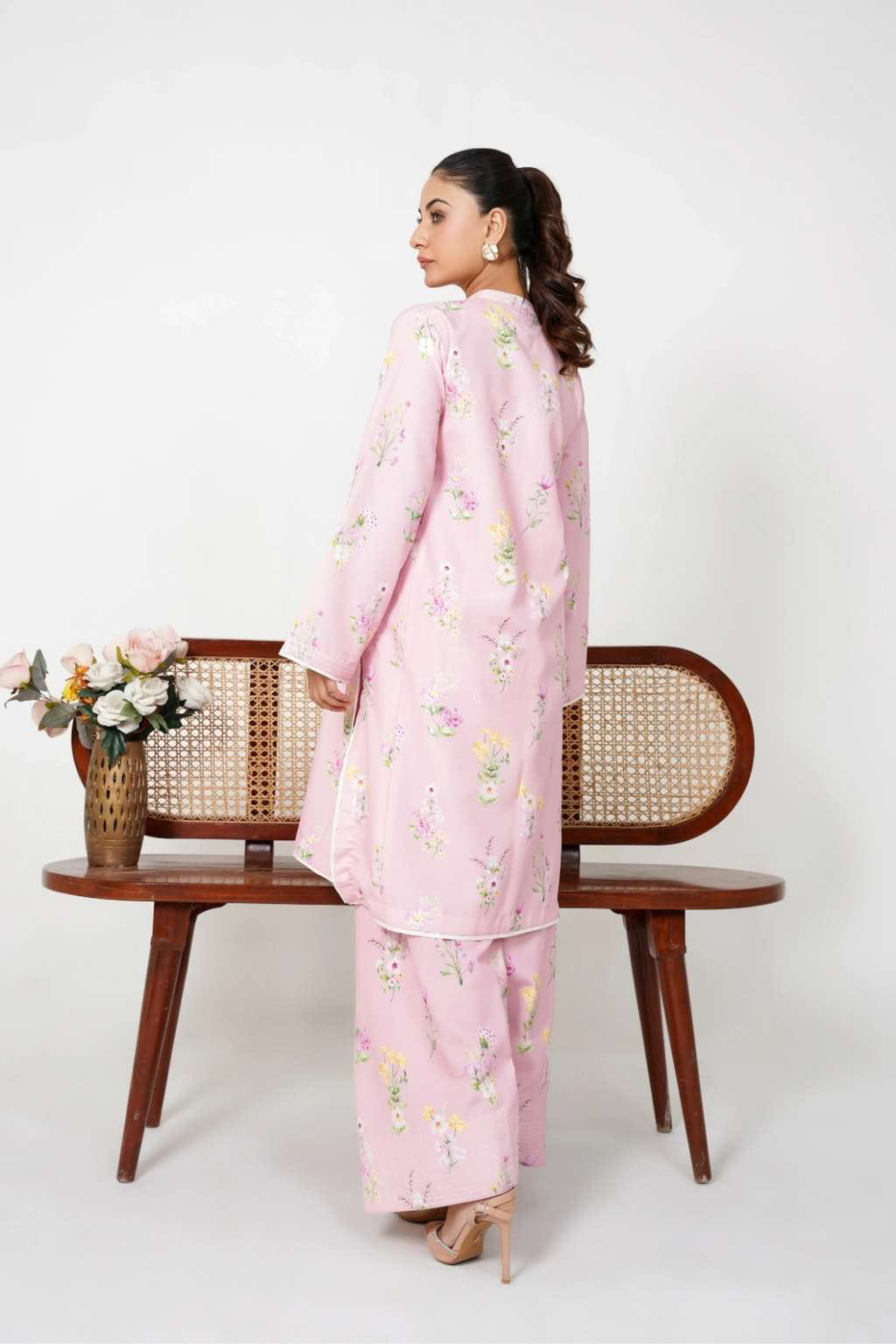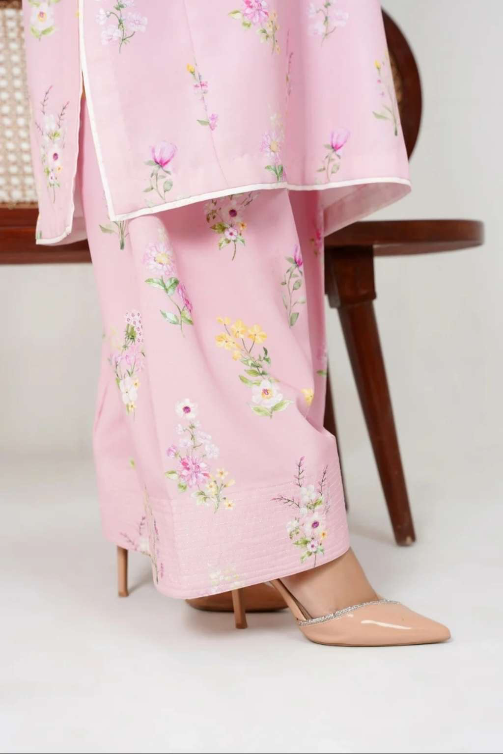 Effortlessly graceful and chic, this pastel pink co-ord set is adorned with delicate floral prints, making it a perfect blend of comfort and elegance.