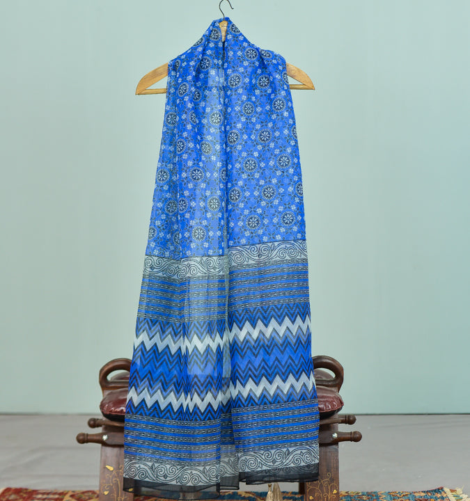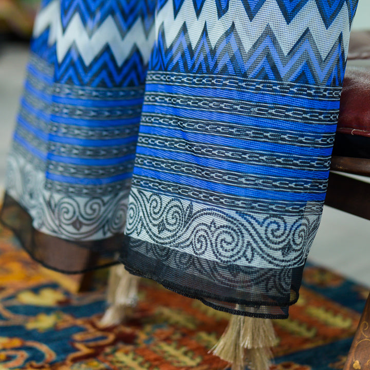 A refreshing shade of blue is used for the base. It is paired with black and white, and features a range of design elements, from linear to botanical. You can pair this dupatta with white or even black kurta. Complete the look with the perfect pink lipstick.