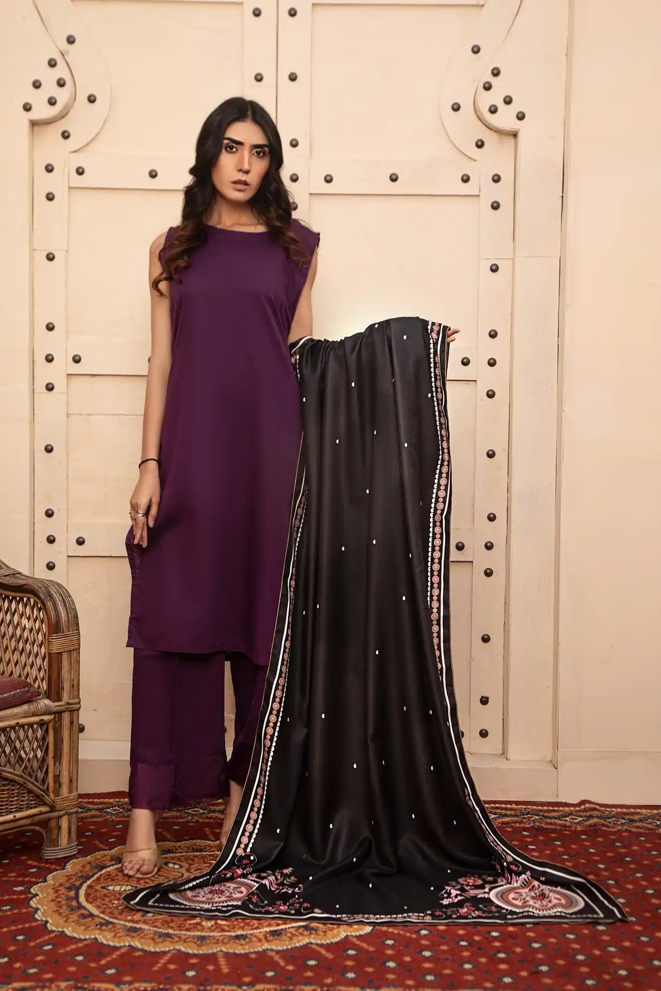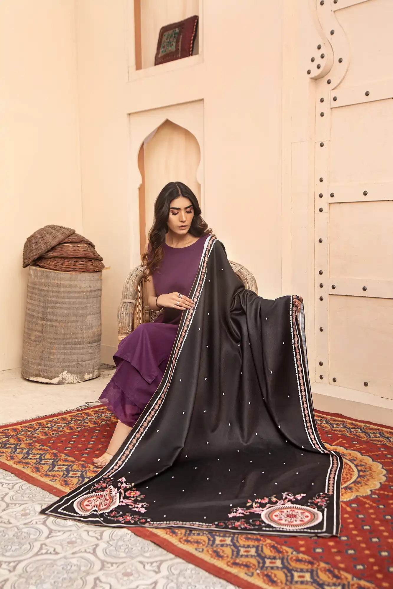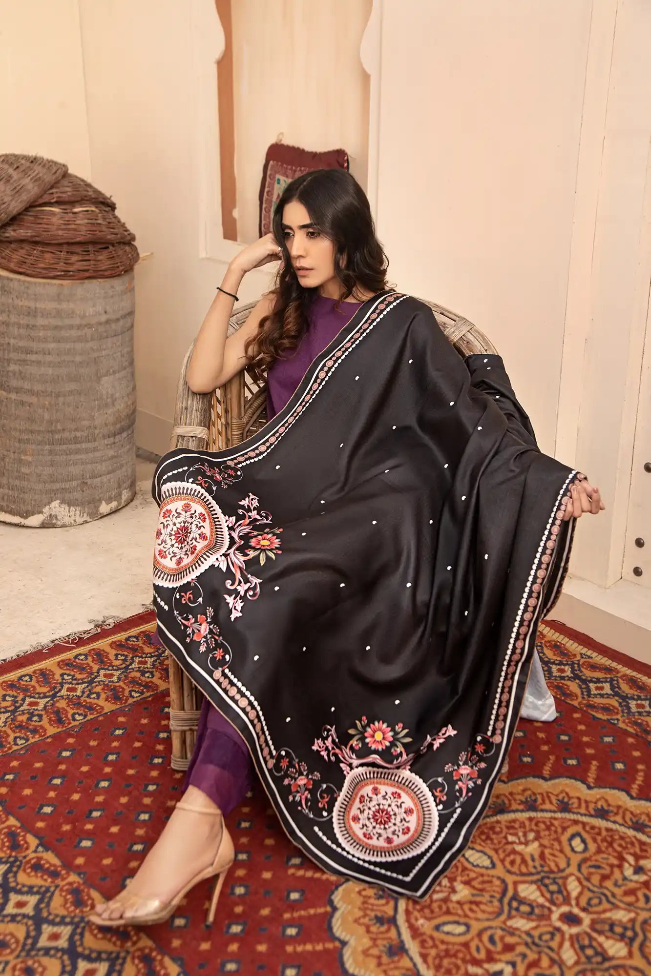 A printed Black shawl with a colorful border is an eye-catching and stylish addition to your wardrobe. You can create a bold statement with the combination of black and bright colors. The shawl can be dressed up or down depending on the occasion. It's perfect for adding a fashionable touch to any outfit, whether it's an everyday look or something more formal. There are many different styles available so you can find one that suits your taste and style perfectly.