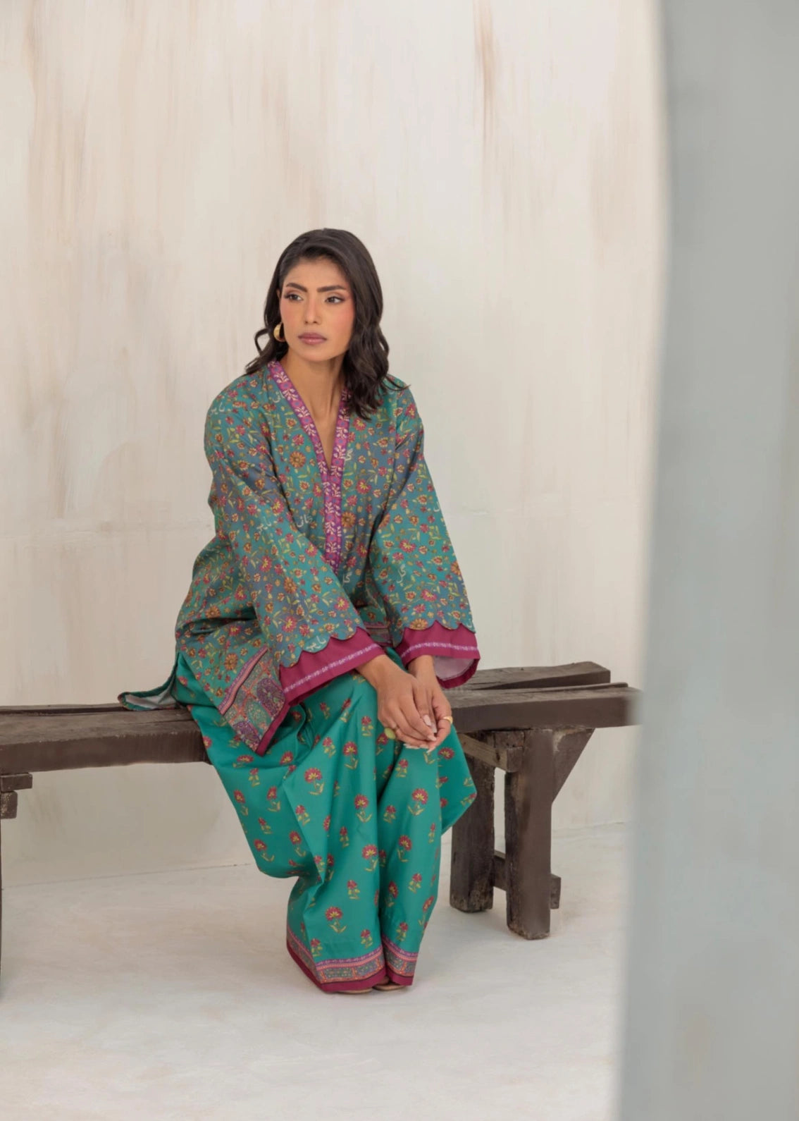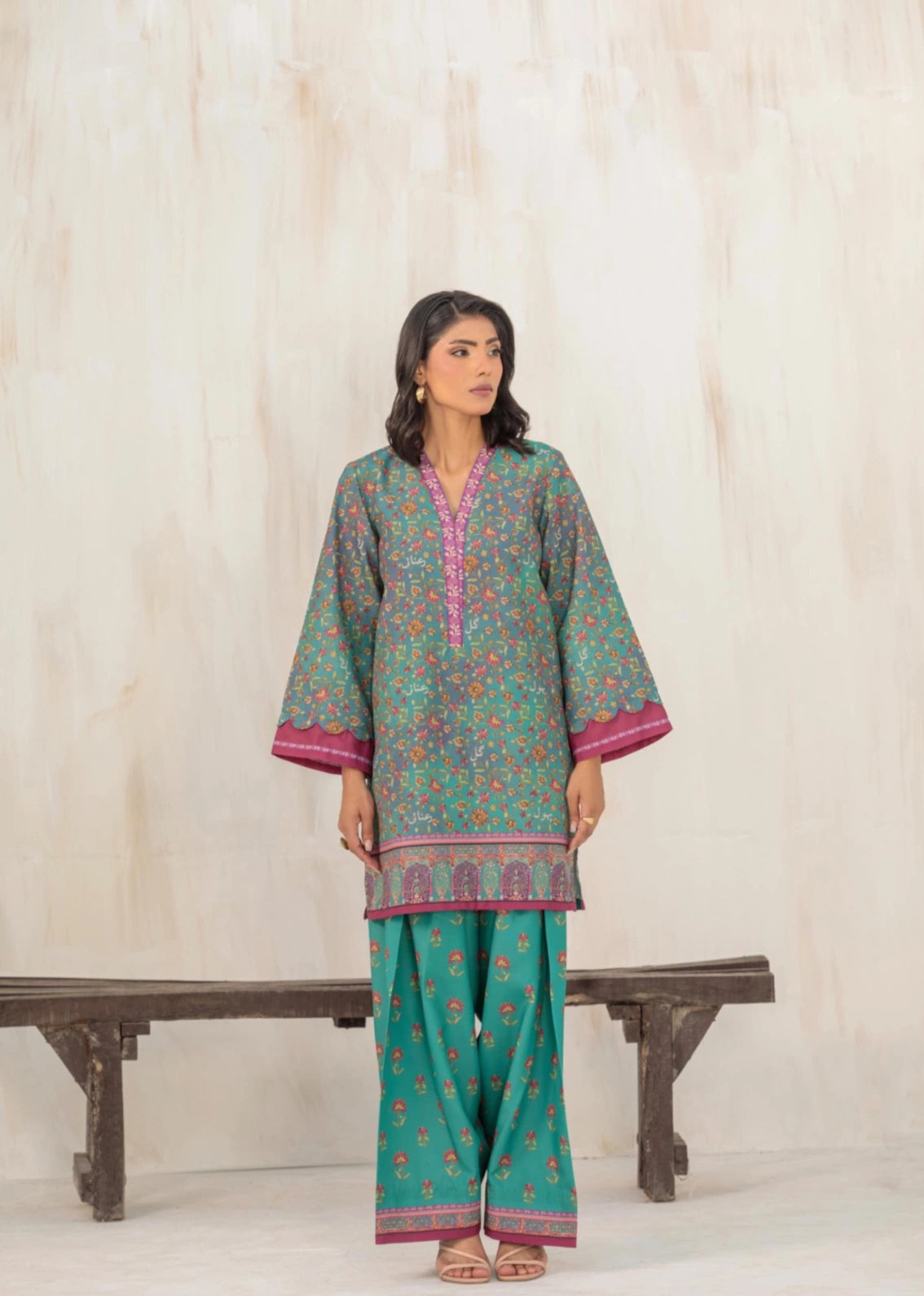 Radiate timeless charm with this teal green two-piece ensemble "Gul" featuring a short shirt and farshi shalwar. The shirt is adorned with a delicate floral print in hues of pink, orange, and mustard, perfectly balanced by a detailed magenta border and neckline that add a pop of color. Its relaxed silhouette and scalloped sleeves exude effortless grace, making it ideal for both casual and semi-formal occasions. The matching farshi shalwar carries coordinated motifs and a printed hem, completing the look with a hint of traditional allure.