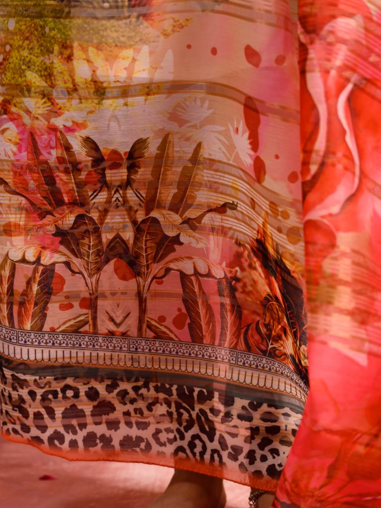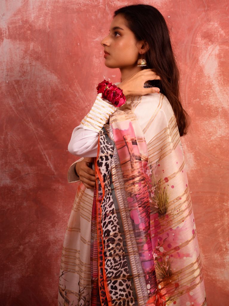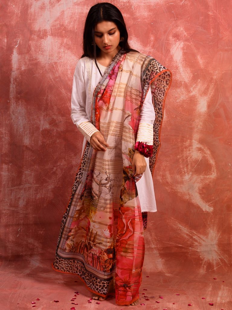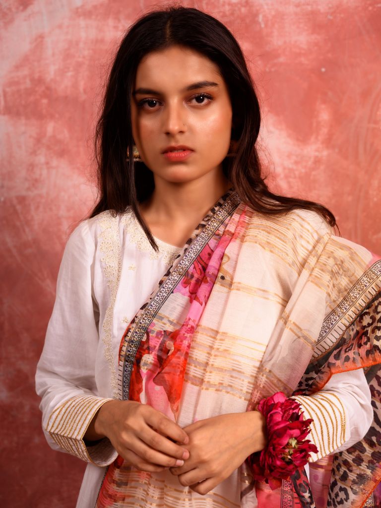 Guleh features a demure white canvas on which the rich, red shades are laid with the lush pinks and magentas. The border is a contrast not just in terms of color, but design as well. The result is a unique and beautiful dupatta that you can flaunt to a variety of occasions.