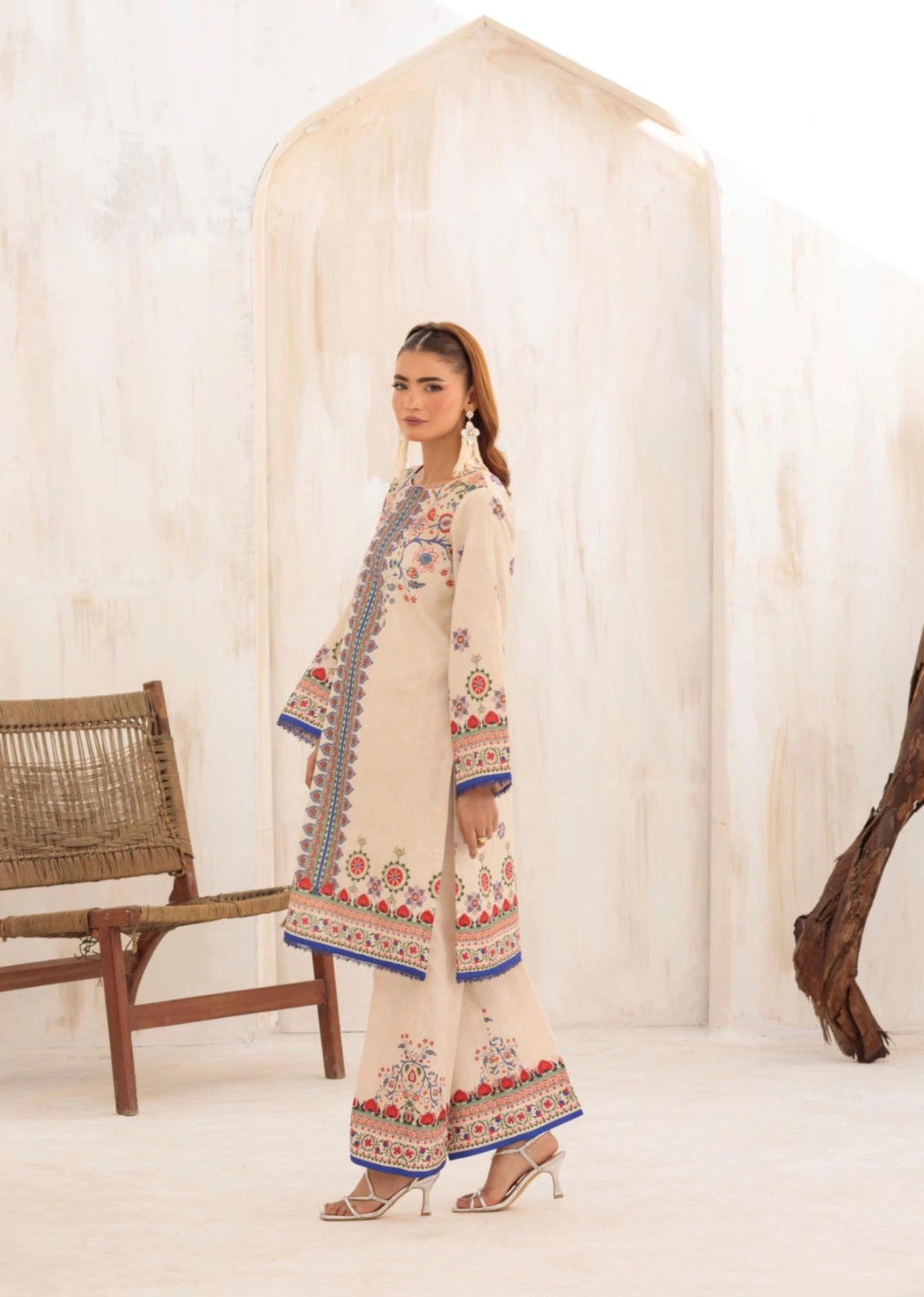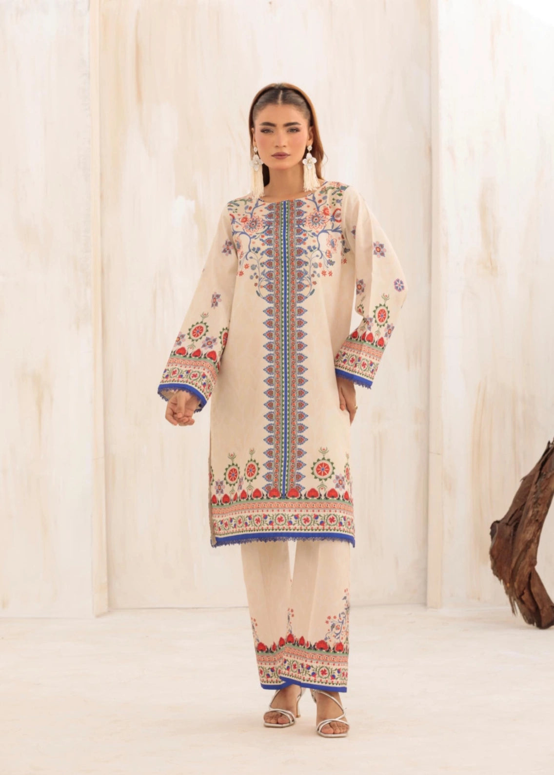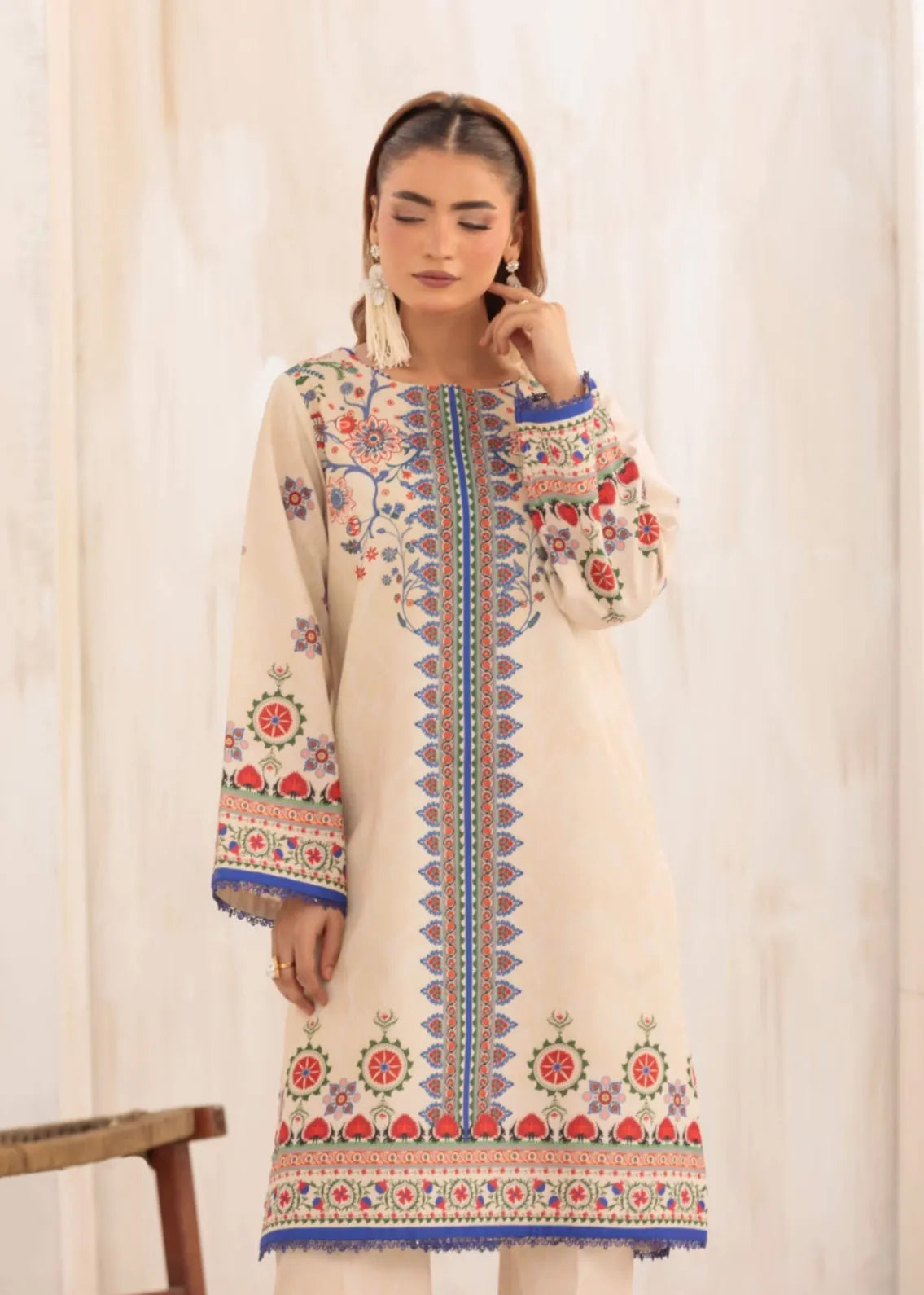 A charming floral-printed, relaxed-fit kurta in a soft beige hue, featuring a round neckline for an effortlessly elegant look. The statement sleeves, adorned with intricate lace and delicate Suzani patterns, add a touch of femininity. Paired with a matching straight-fit trouser, boasting complementary Suzani motif borders, this ensemble exudes grace and sophistication perfect for daytime gatherings or festive occasions.