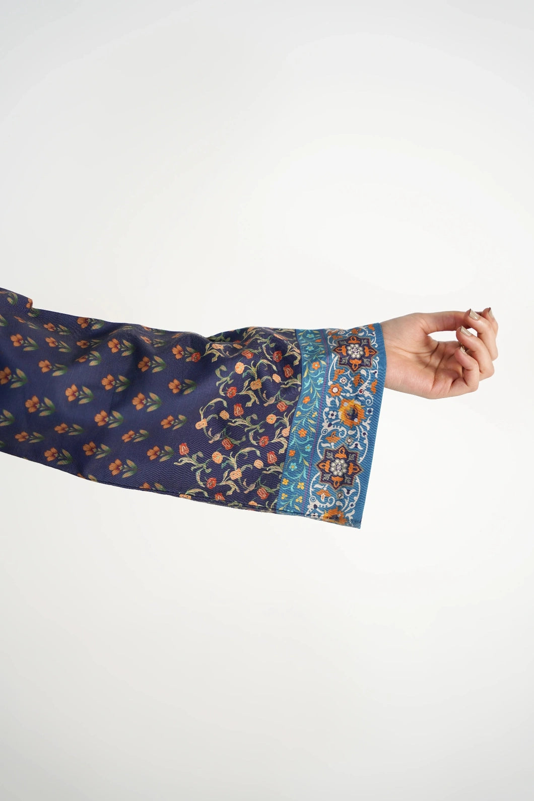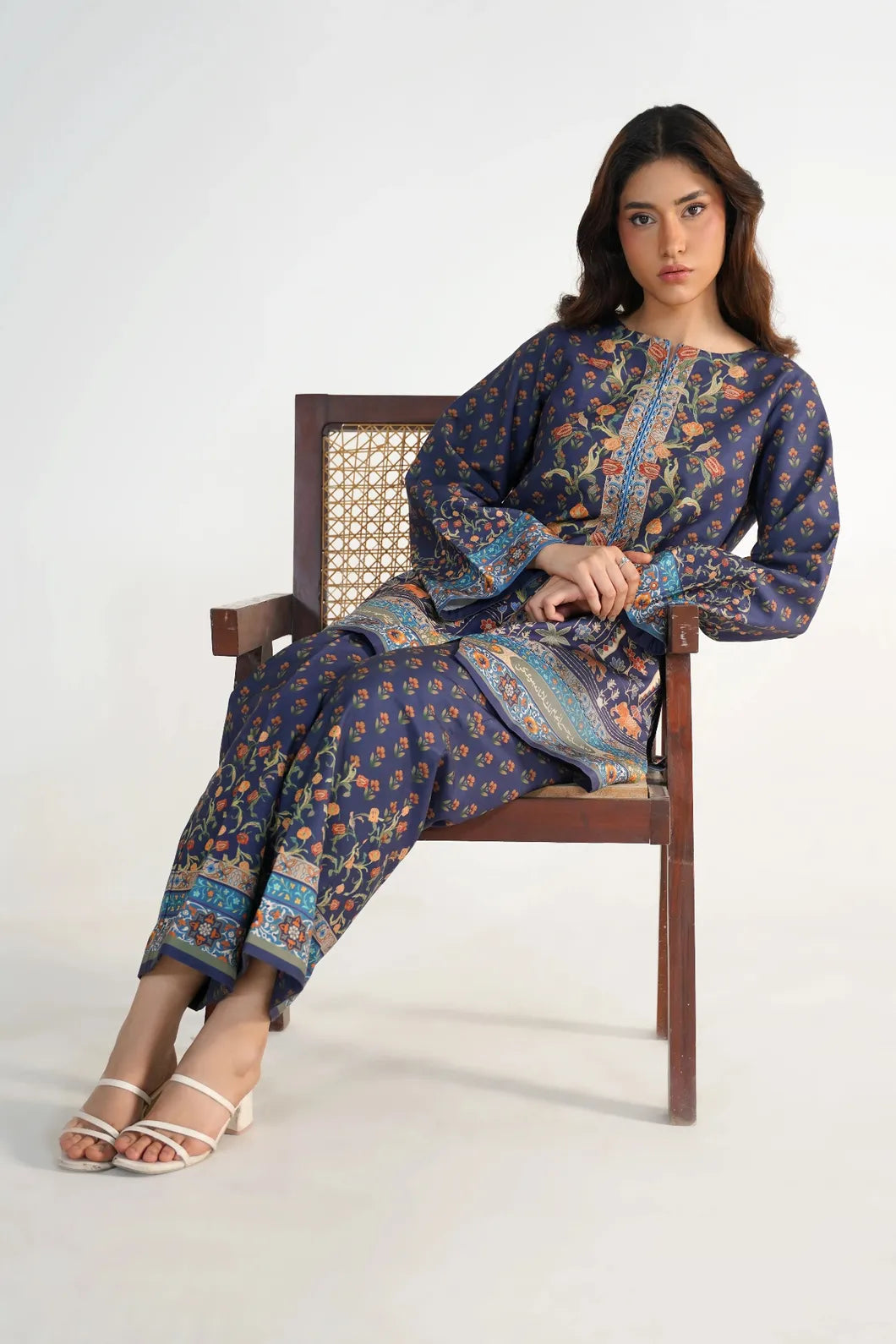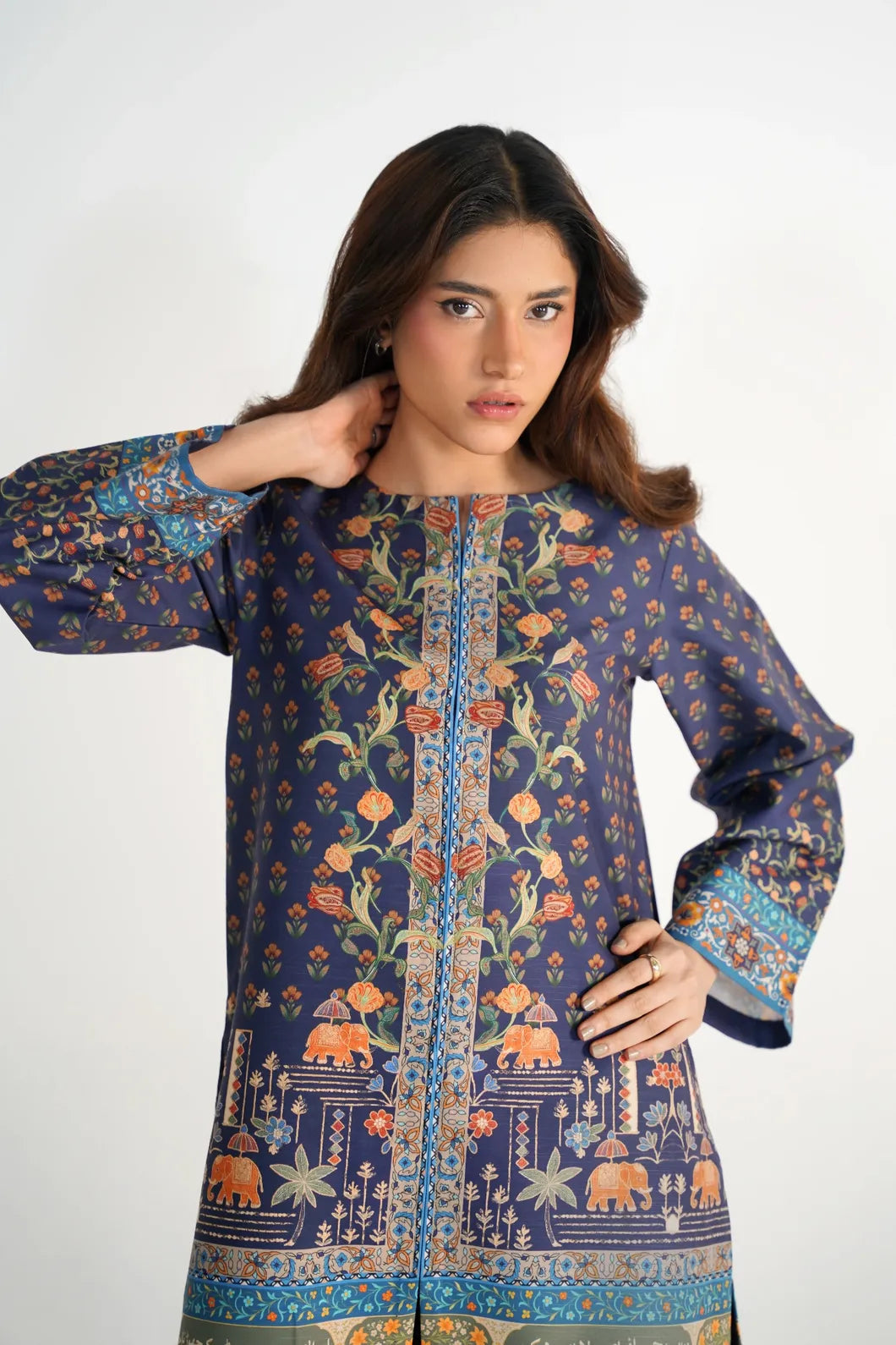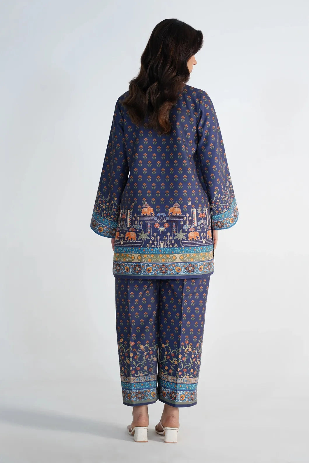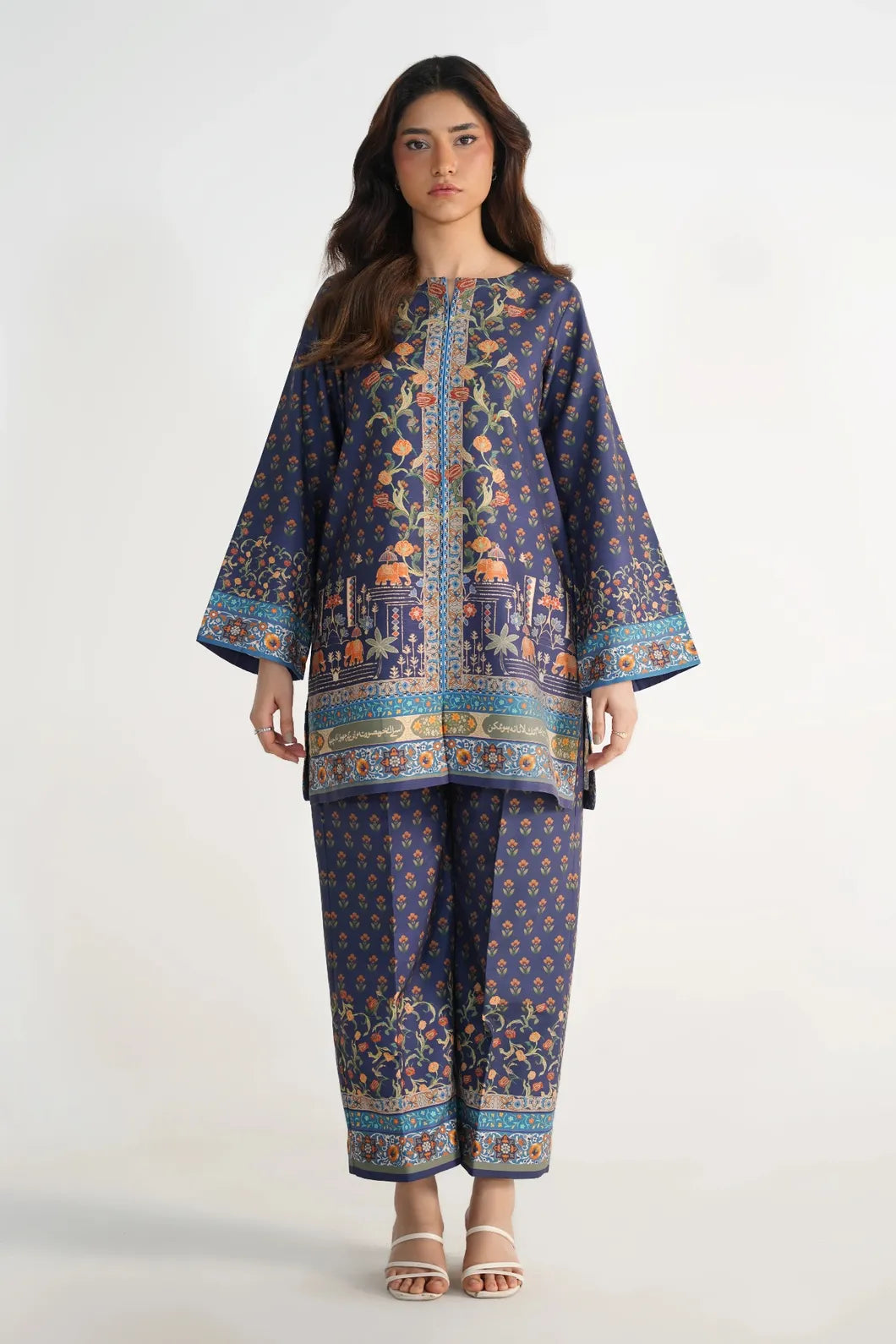 A refined two-piece set by Zaymal that blends modern tailoring with traditional artistry. Crafted in breathable cambric, this outfit features a straight-cut kurta with a subtle front slit, adorned with intricate traditional motifs, detailed borders, and accents of Urdu poetry. Paired with matching printed trousers, it offers an effortlessly elegant look for everyday wear.