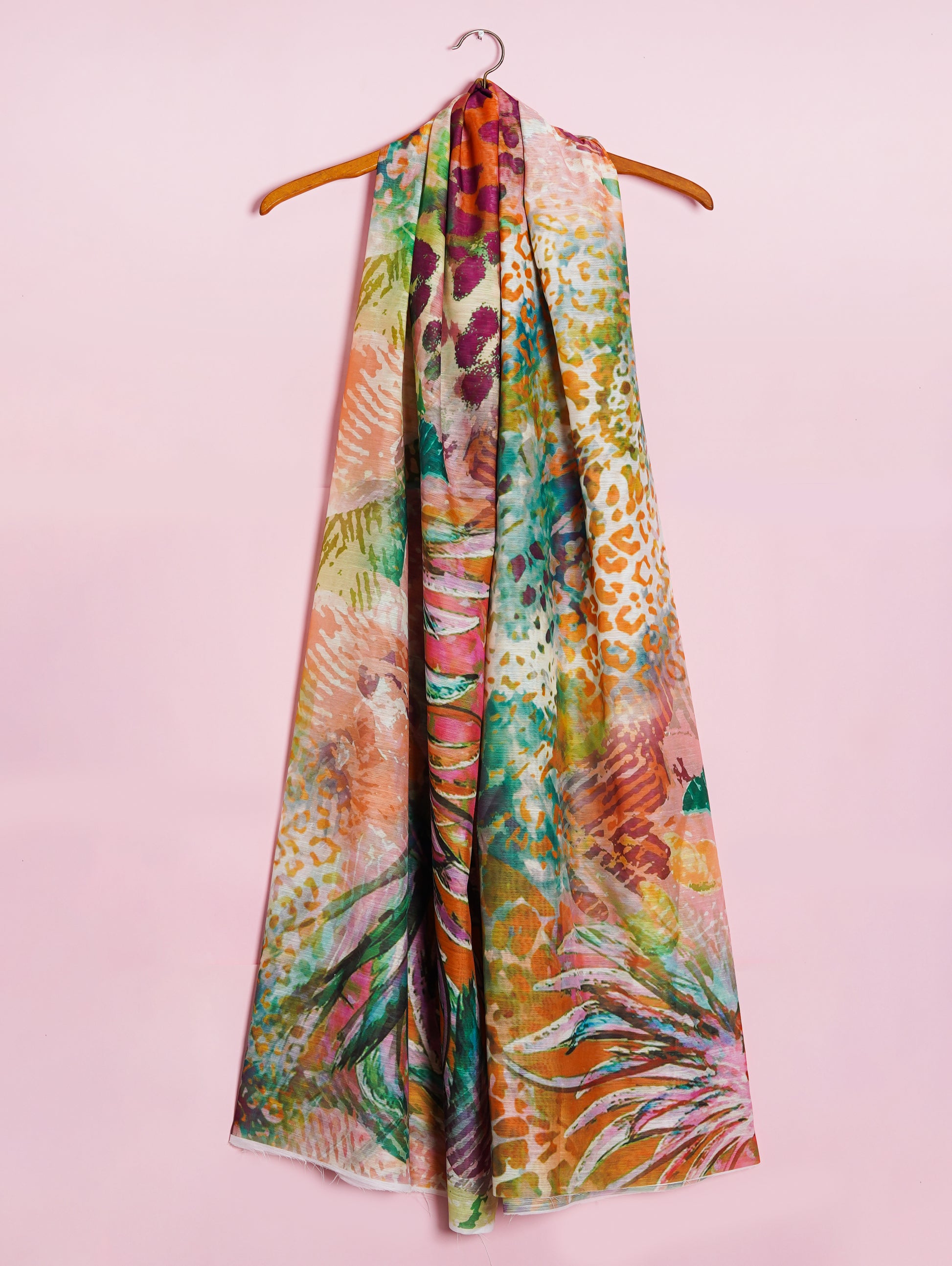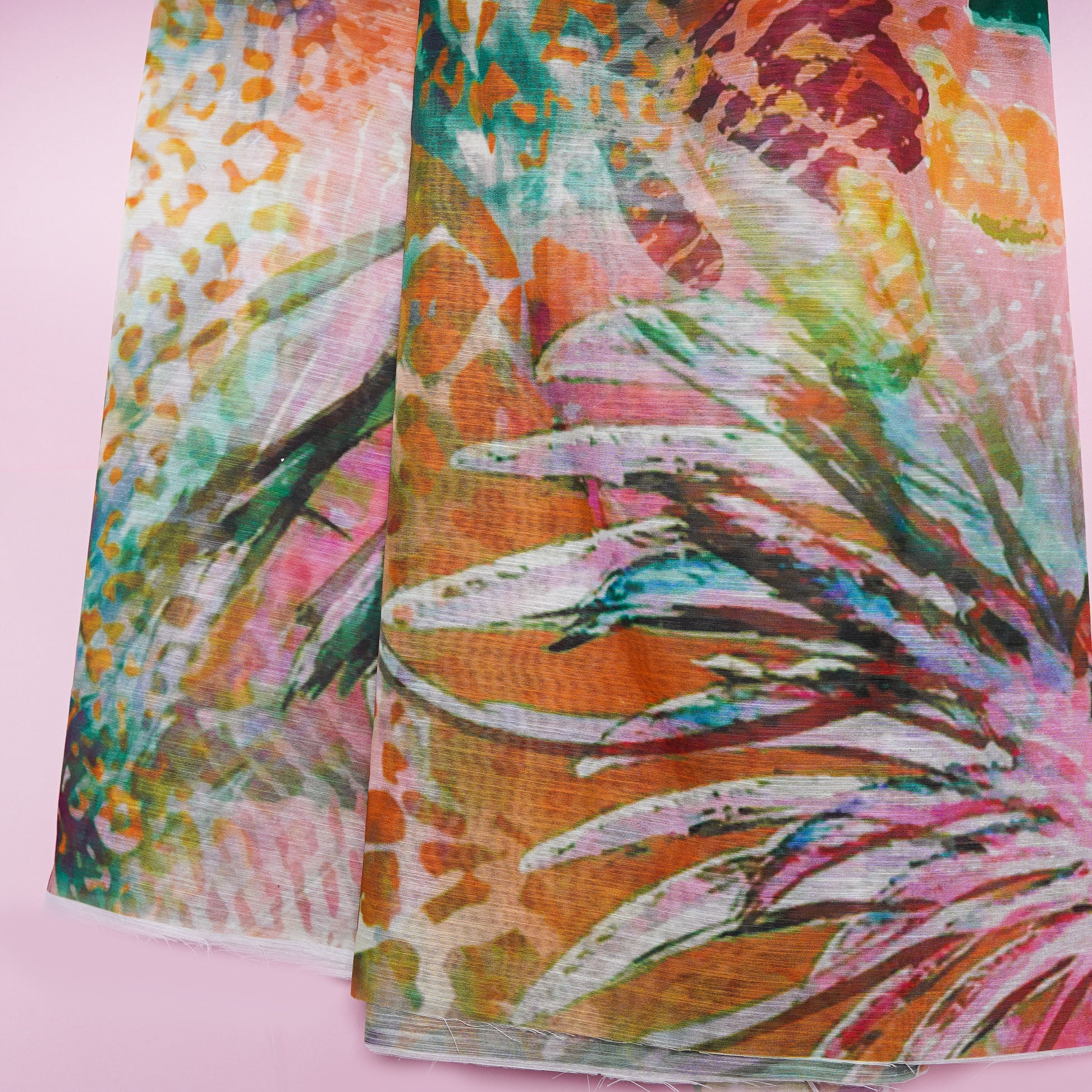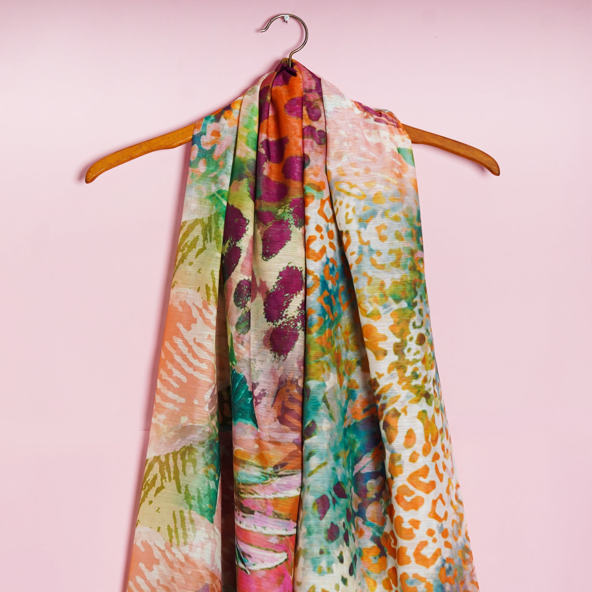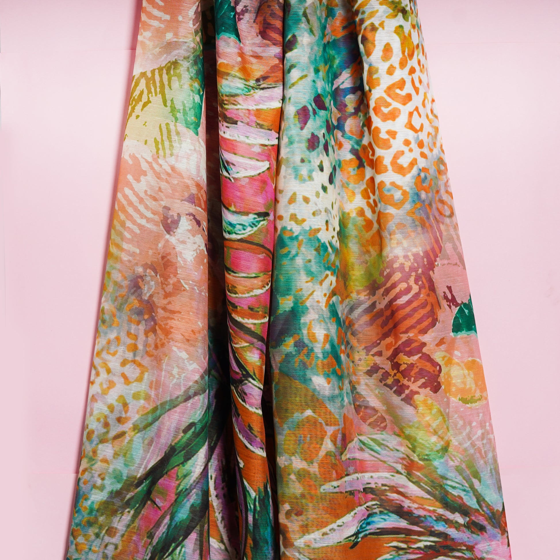 The brush was dipped in different color palettes to bring together the perfectly balanced colorful print. The merging of colors, the juxtaposition of shades, the fluidity of the print makes Parvaneh a must have for all the rungeen souls!