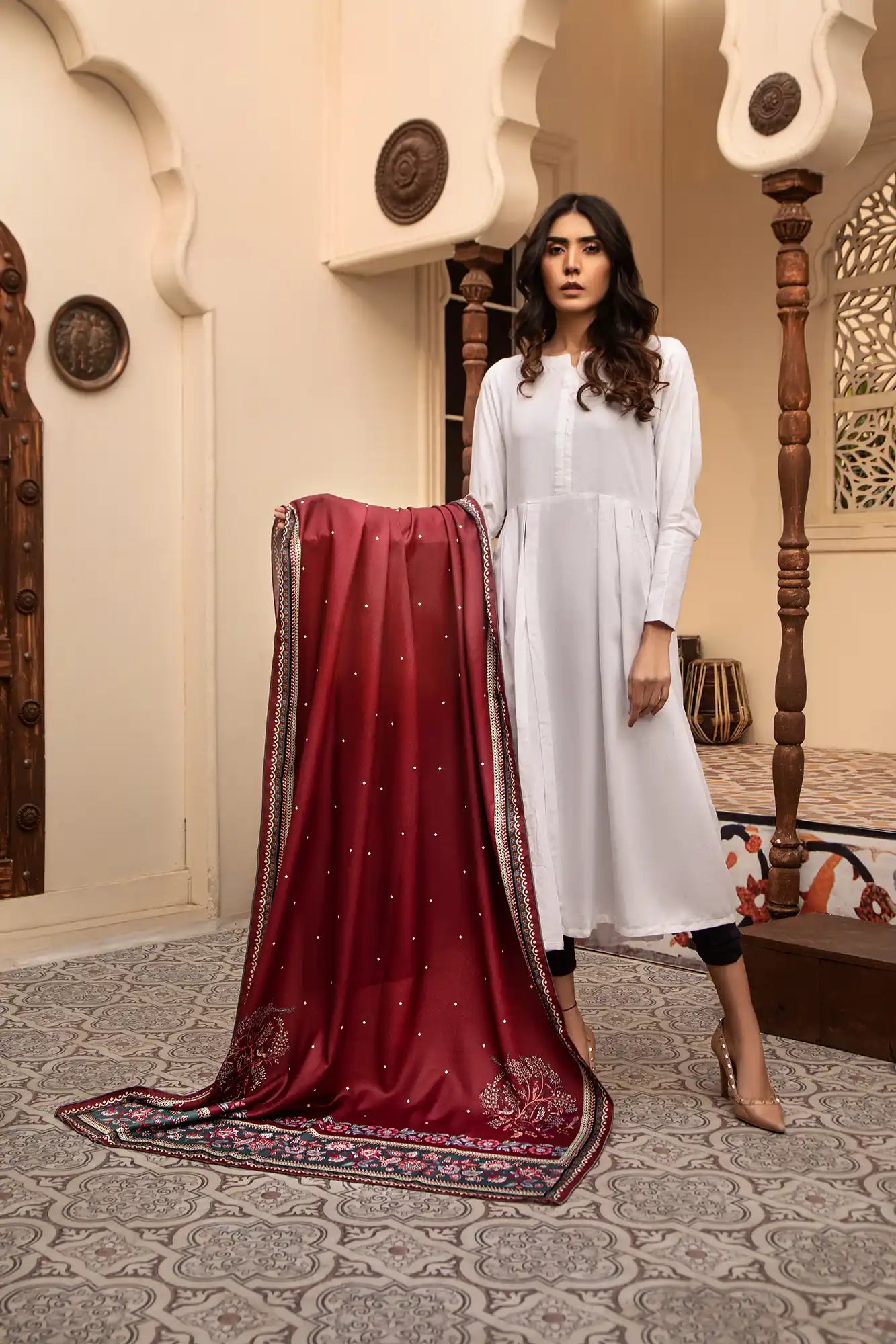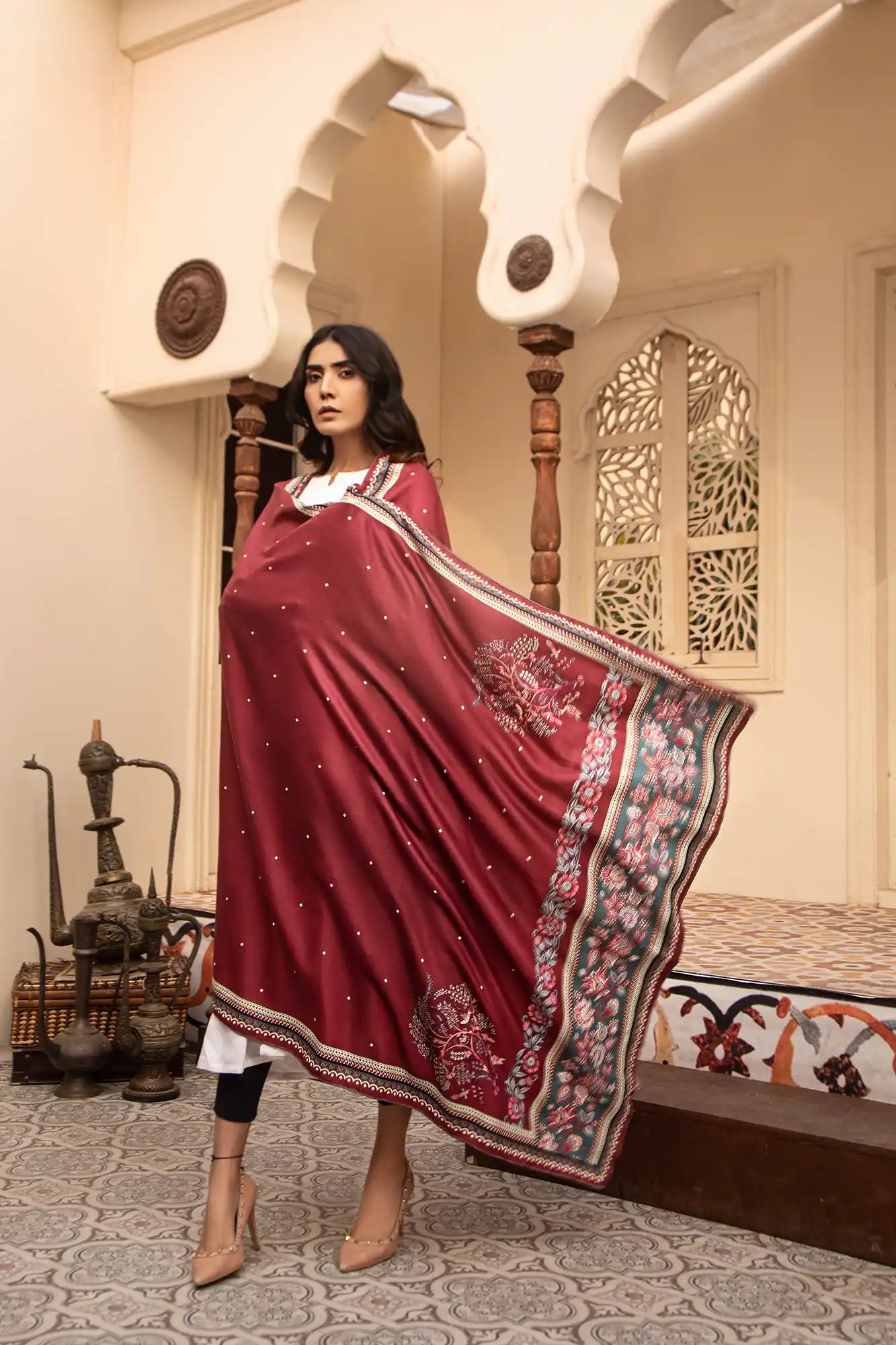 A printed Red shawl with a colorful border is an eye-catching and stylish addition to your wardrobe. You can create a bold statement with the combination of black and bright colors. The shawl can be dressed up or down depending on the occasion. It's perfect for adding a fashionable touch to any outfit, whether it's an everyday look or something more formal. There are many different styles available so you can find one that suits your taste and style perfectly.