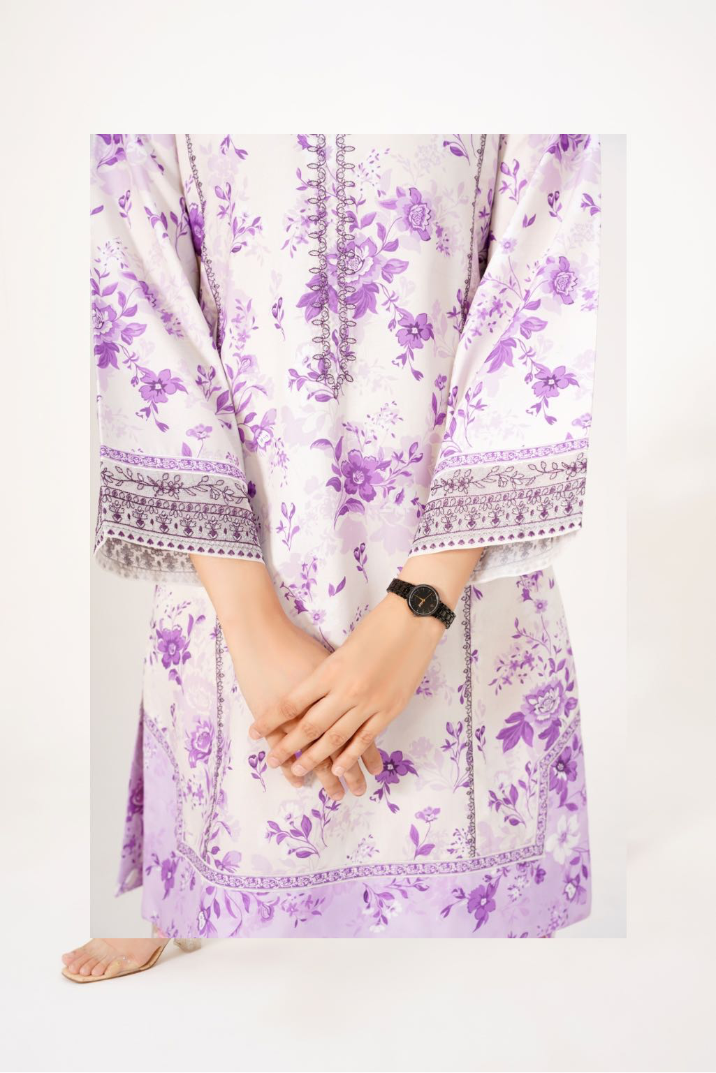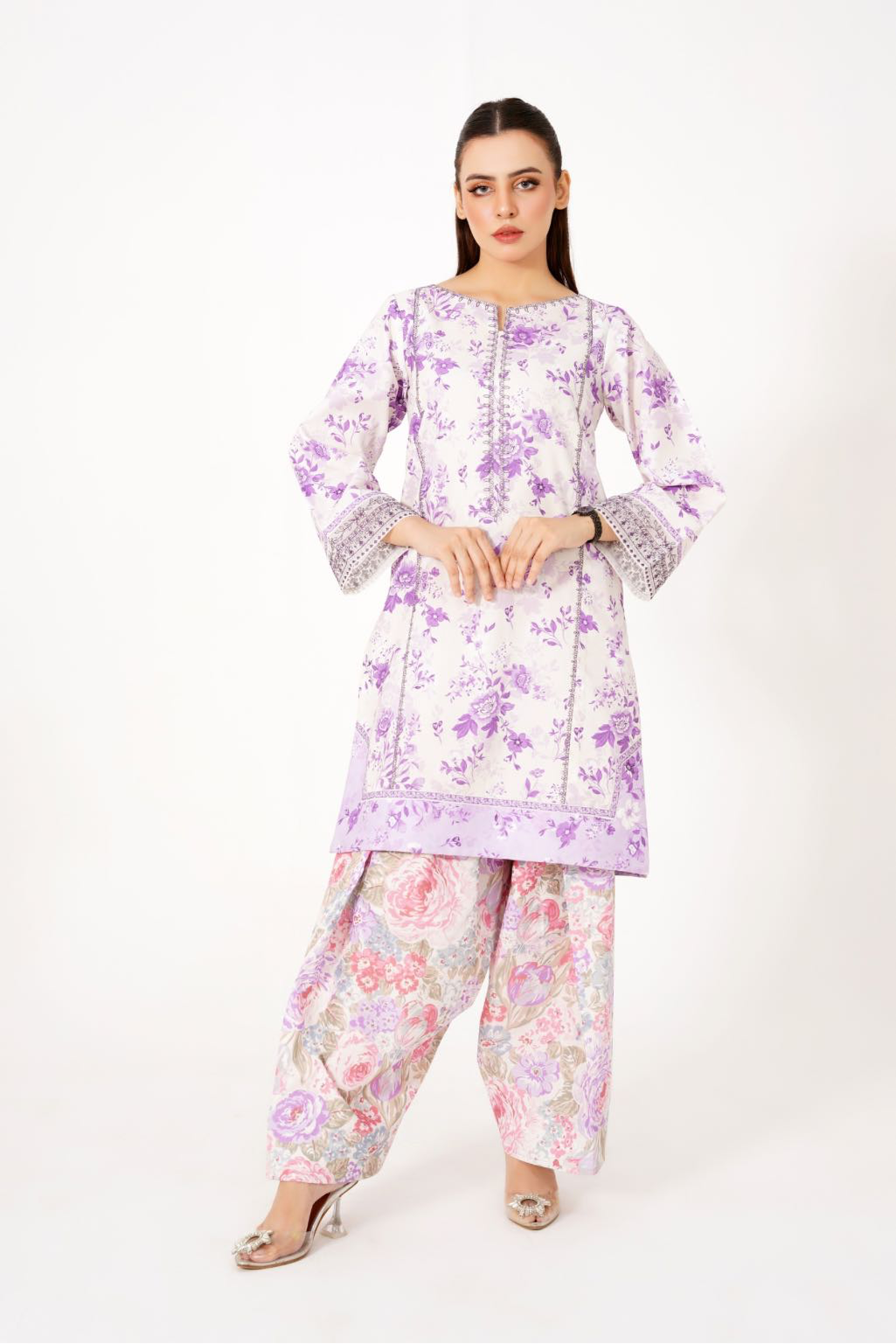 The shirt features organza borders on the sleeves with silver and purple thread- work that add a luxe finish. Paired with a vibrant farshi shalwar blooming in pastel tones, this look is both bold and beautiful.