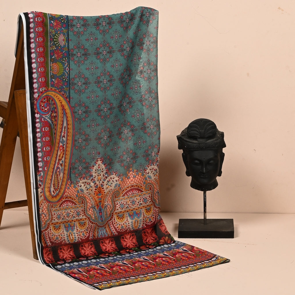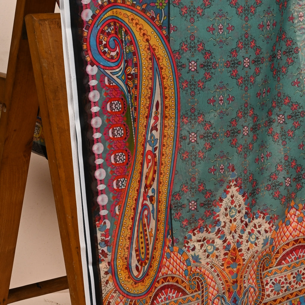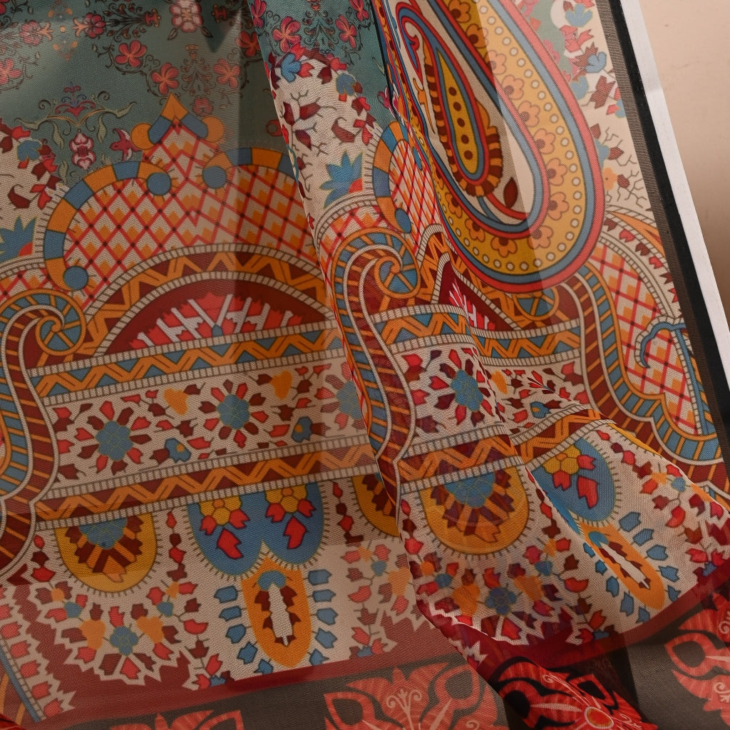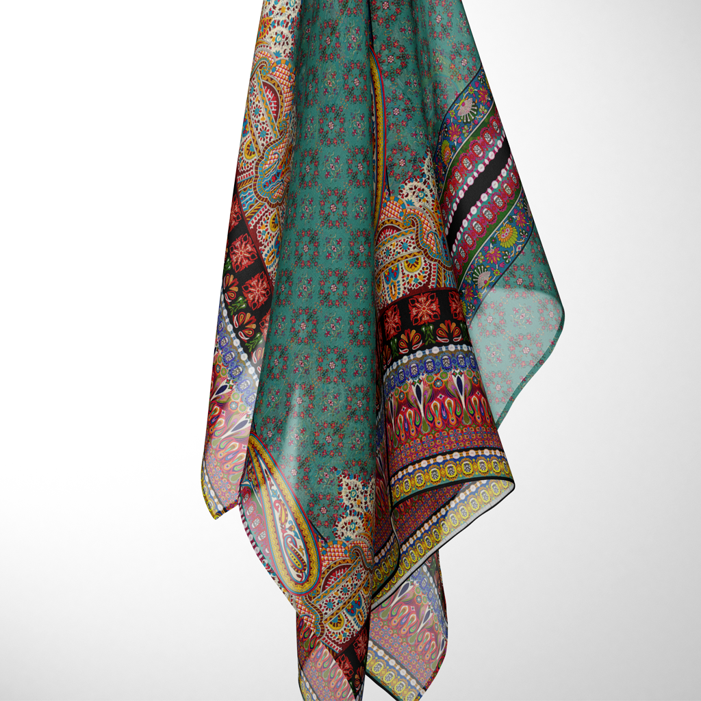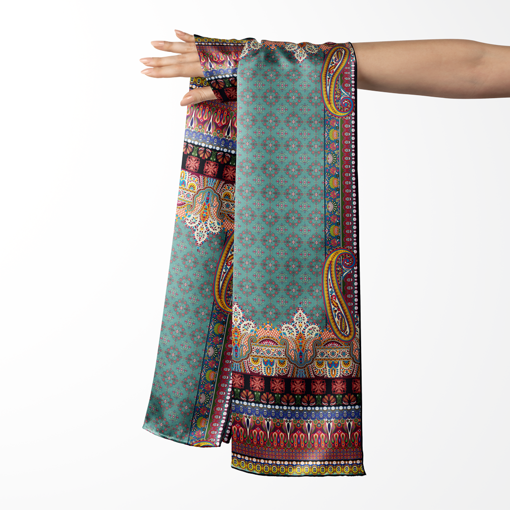 Featuring deep turquoise and Robin’s egg blue, Tirkiz combines paisleys, geometric and botanical elements to bring together a beautiful dupatta. Miscellany of colors adds another dimension to the piece then.
