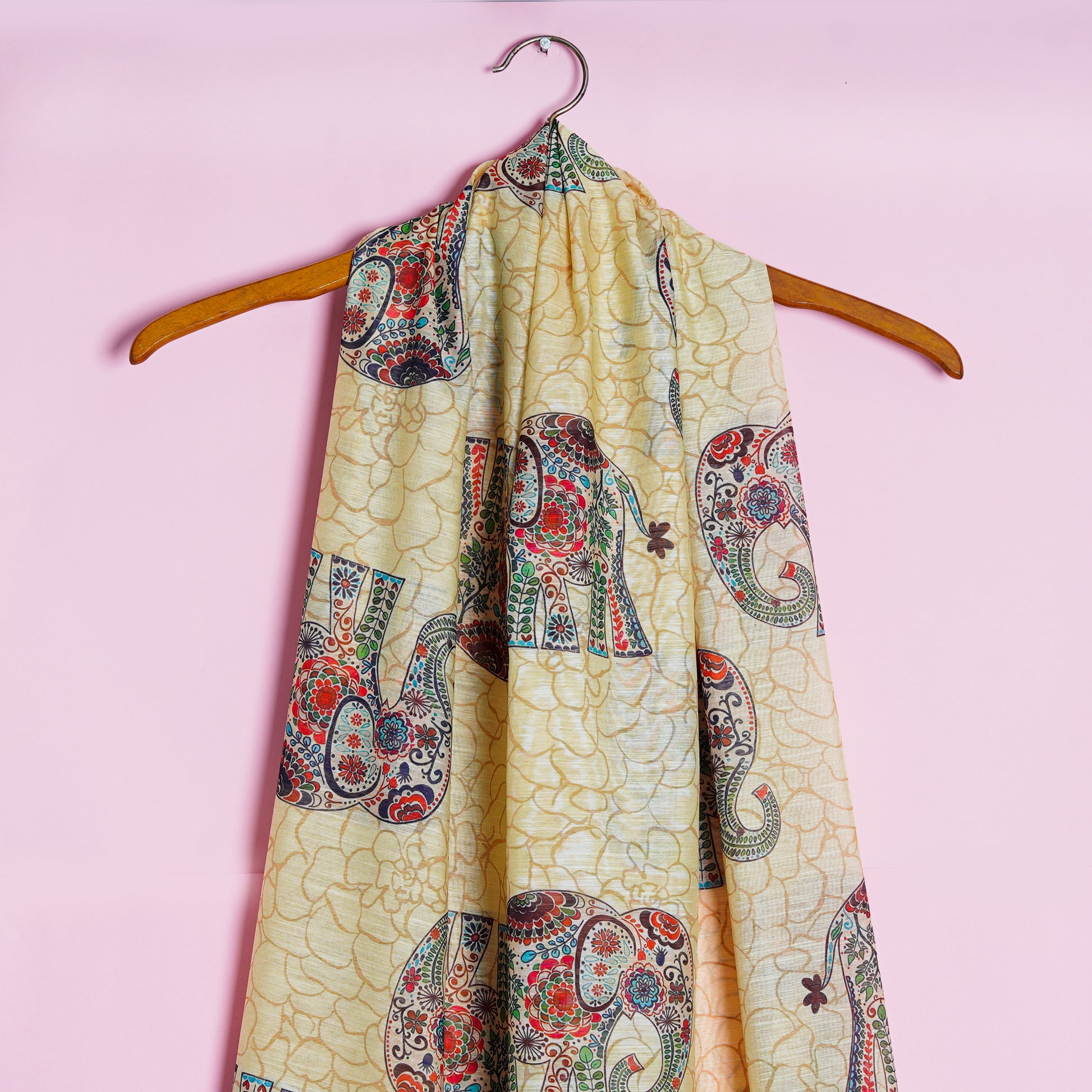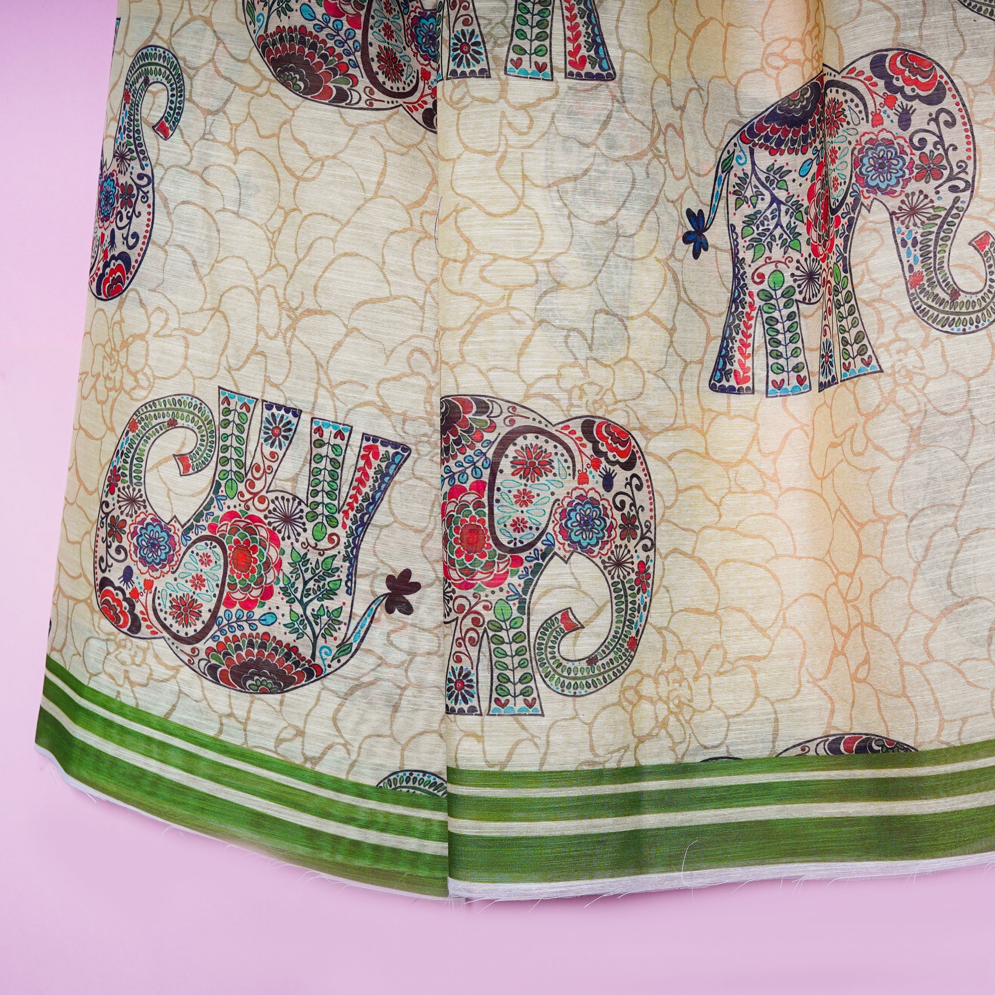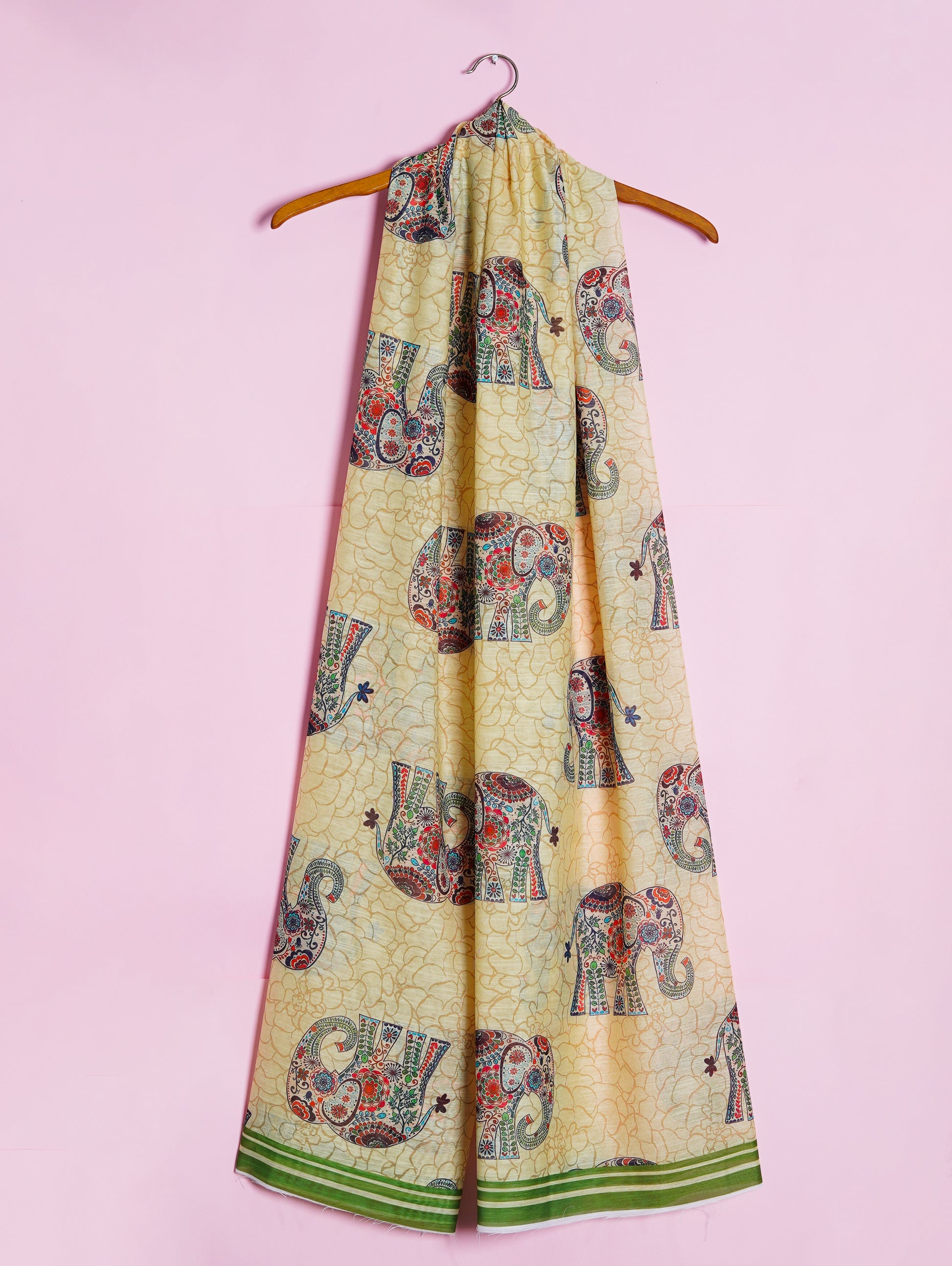 Inspired from Mughal art, this statement dupatta has an open cream and parchment white canvass, that is paired with forest green. Beautiful floral elements adorn the elephant motifs to add daintiness to the piece. Drape this dupatta over forest green solids, tie the hair in a low bun, don on a pair of neutral khussas for a the perfect demure yet daring look.