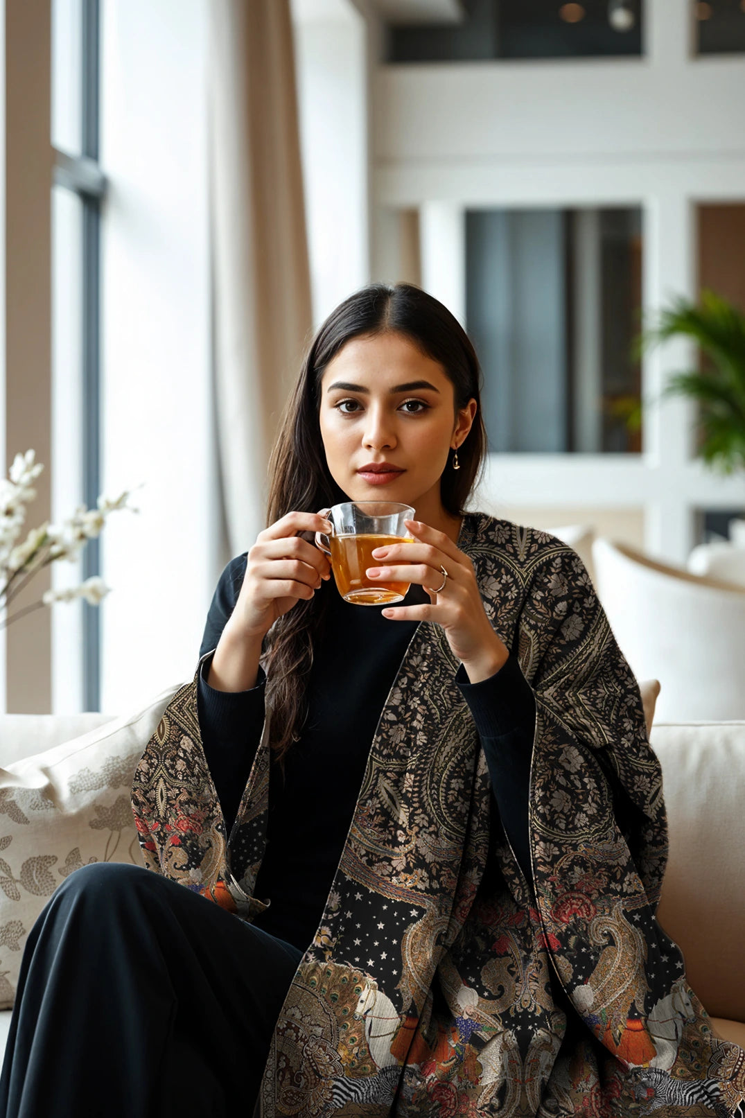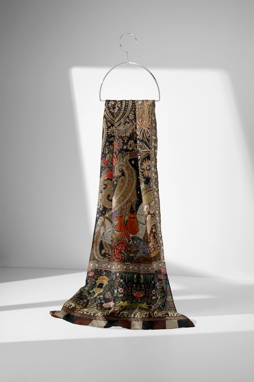 Zuri is a striking shawl that blends traditional artistry with contemporary elegance. Draped in a rich palette of crimson, orange, and green, it features intricate motifs inspired by Mughal miniature aesthetics, delicate florals, and ornate patterns. The vibrant colors and detailed designs evoke a story of heritage and grandeur, making it a timeless accessory for festive and winter wardrobes. Its bold yet graceful presence makes it perfect for both casual layering and statement styling.